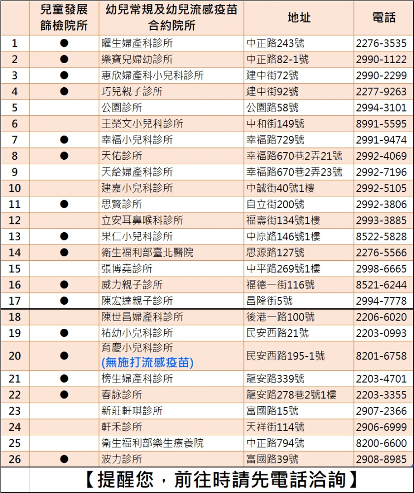 新莊區-幼兒常規、流感疫苗合約院所(含兒童發展篩檢院所)